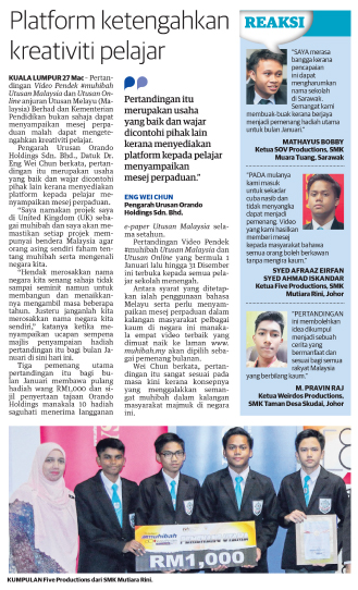 #MUHIBAH VIDEO PENDEK TIGA SEKOLAH JADI PEMENANG Post author:admin Post published:March 28, 2018 Post category:Media Limelight / News Post comments:0 Comments Tags: Utusan Malaysia Read more articles Previous PostKE ARAH MENCAPAI STATUS NEGARA MAJU You Might Also Like STAR OUTSTANDING BUSINESS AWARDS 2017 January 19, 2018 Final block of Lavile Kuala Lumpur by Orando Holdings Launched October 12, 2020 大马可发展创业产业 September 20, 2020 Leave a Reply Cancel replyCommentEnter your name or username to comment Enter your email address to comment Enter your website URL (optional) Save my name, email, and website in this browser for the next time I comment.